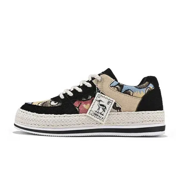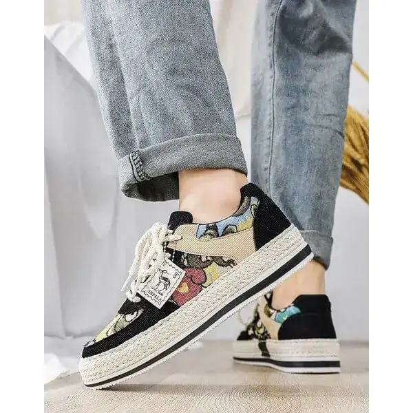 • Stylish Color-Matching Pattern with Braided Soles:Color-matching design in Beige, Black, and Green with braided soles and "IMPIALA" branding offers a trendy, cohesive look.